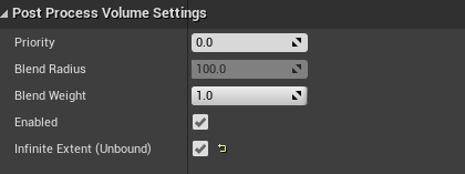 3) On the left side of the screen you can find the "PostProcessVolume" (in the Volumes tab or use the "search classes" textfield). Drag and drop the PostProcessVolume it into your scene. Change the settings in "Post Process Volume Settings". This allows the effects of your post process volume to be global for the whole level.