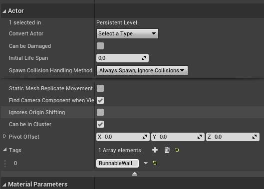 - To make walls runnable you need to go into the Actors section of the Mesh and add "RunnableWall" as an actor tag.