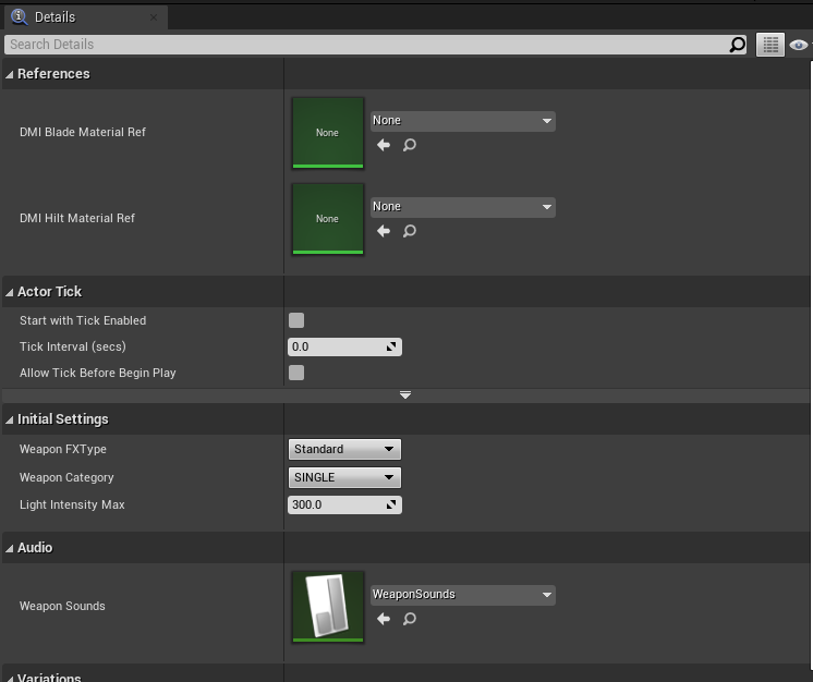 8) Open up the construction script of the "MyFirstWeapon" blueprint. This is where you can add any initial settings you want. For example making the blade's emissive material not glow when the weapon is spawned.