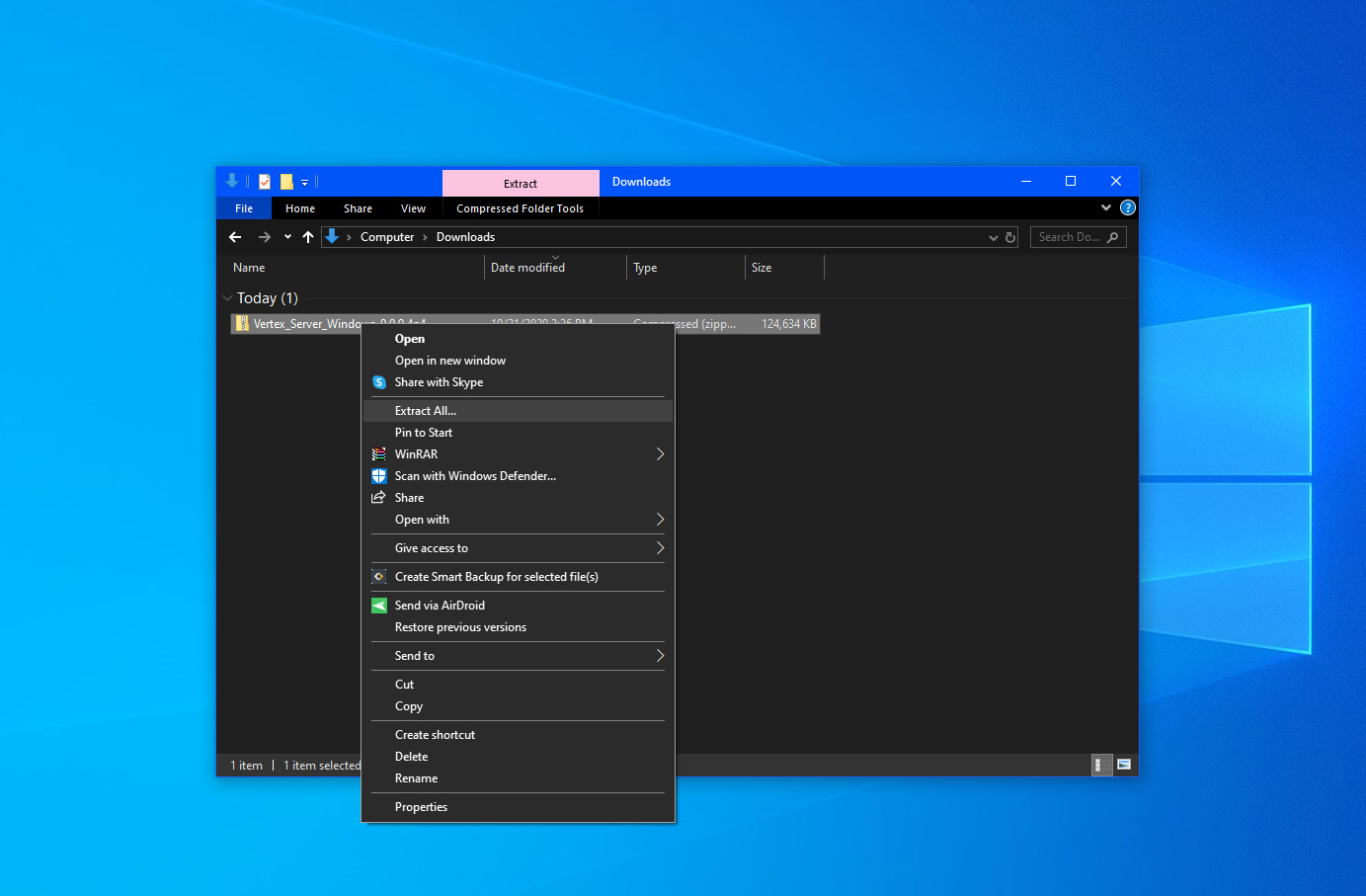 2) Once downloaded, right-click on the "Vertex_Server_Windows_x.x.x.x.zip" file and select "Extract all..." to unzip it's content.