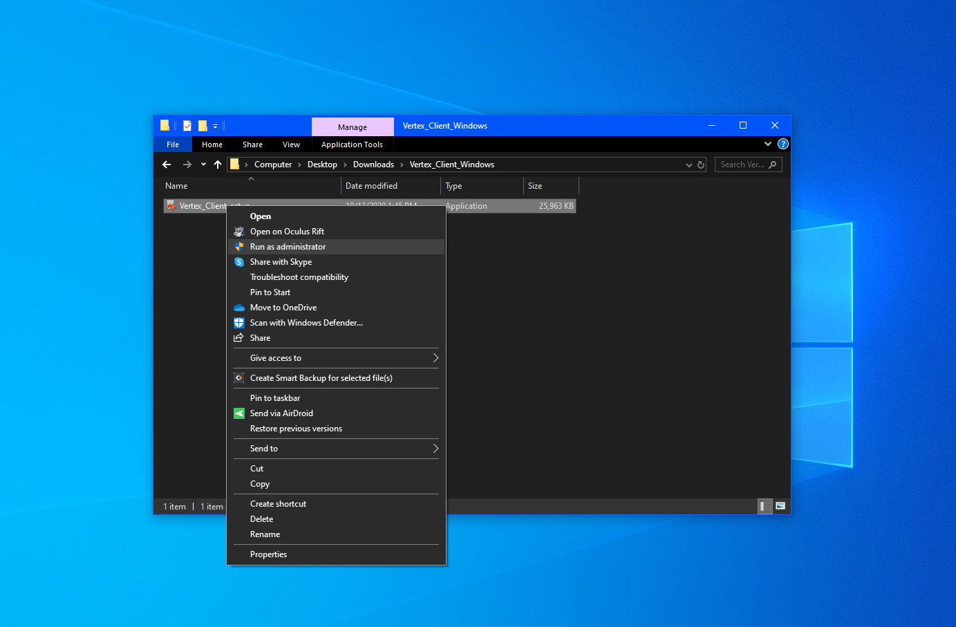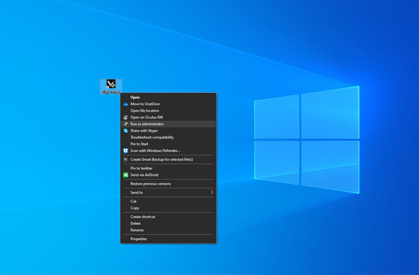 6) You should now have a Desktop shortcut called "Play Vertex". Simply right-click on the shortcut and select "Run as administrator" to start the Launcher.